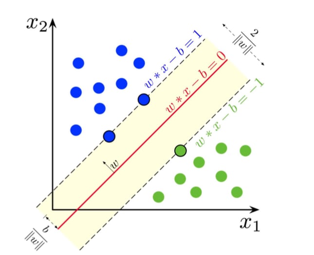 :红色的线为超平面,落 在两侧的虚线上的点为支持向量,计算得到的𝑦值即1(正类)或-1(负类),蓝色的点为正 样本,绿色的点为负样本,目的是找到虚线之间的距离最大的𝑤值,因为距离越大表示二分类 模型效果越好。 (来源: https://en.wikipedia.org/wiki/Support-vector_machine