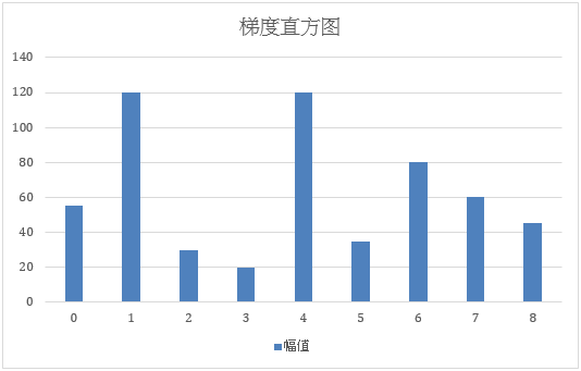 图8:梯度直方图实例。横轴为bin序号,纵轴为计算出的幅值。本图纵轴对应的数字仅为举例说明,例如,上图三张表格中的bin1幅值加和得到80+40+0=120作为最终结果,则直方图纵坐标得到120,继续做计算,bin1 的值会继续累加。