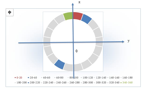 图9:有方向的插值方法,每一个扇形区域代表一个bin覆盖角度范围值。红色为一号bin,覆盖0-20度。顺时针方向依次标号,绿色为终点,340-360度。蓝色区域为相对应的两个方向的bin.