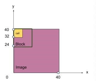 图4:block在剪裁图片上的移动过程,由图可知4个cell组成一个边长为16个像素值block,图片经剪裁得到长宽均为40个像素值。步长为1, 即每次移动一个像素值。