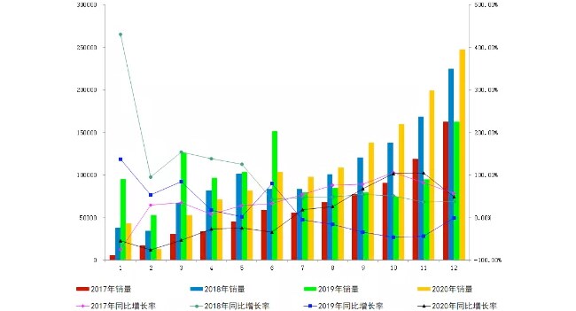 图1:2017-2020年月度新能源汽车销量及同比变化情况(图源:工信部网站)