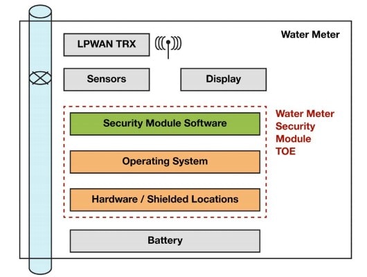 威胁建模首先是对系统的准确描述,即所谓的评估目标 (TOE),与特定的用例相关,例如公用水表的操作。如果说威胁模型描绘出了系统漏洞的画面,那么TOE描述就是画布。通过扩大或缩小TOE范围,威胁建模团队可以在威胁识别过程中扩大或缩小关注点。例如,Arm最近发布的智能水表威胁模型严格地限制了它的TOE,只关注系统核心 (图1)。