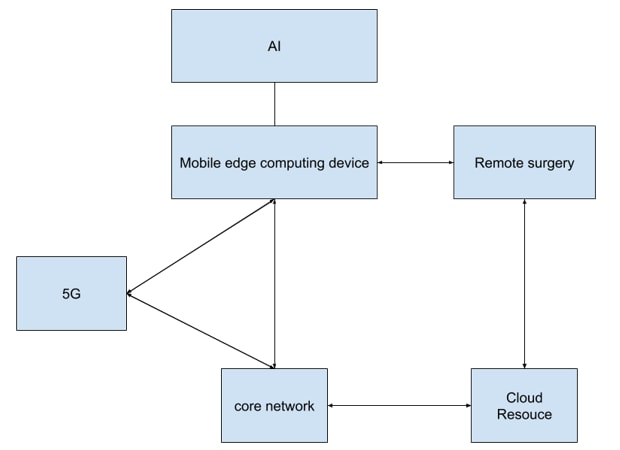 上图描绘了5G应用于远程手术的过程。医生手术的时候需要对数据进行分析并得到结果,could resource里存储了大量的数据供医生参考,医生的手术新数据也可以传到云资源(cloud resource),根据5G 网络的核心网络并结合网络切片技术,然后通过网络分发到边缘站点进行分析(边缘计算中心运用人工智能以及机器学习技术对数据分析预测后,将结果返回给医生)。