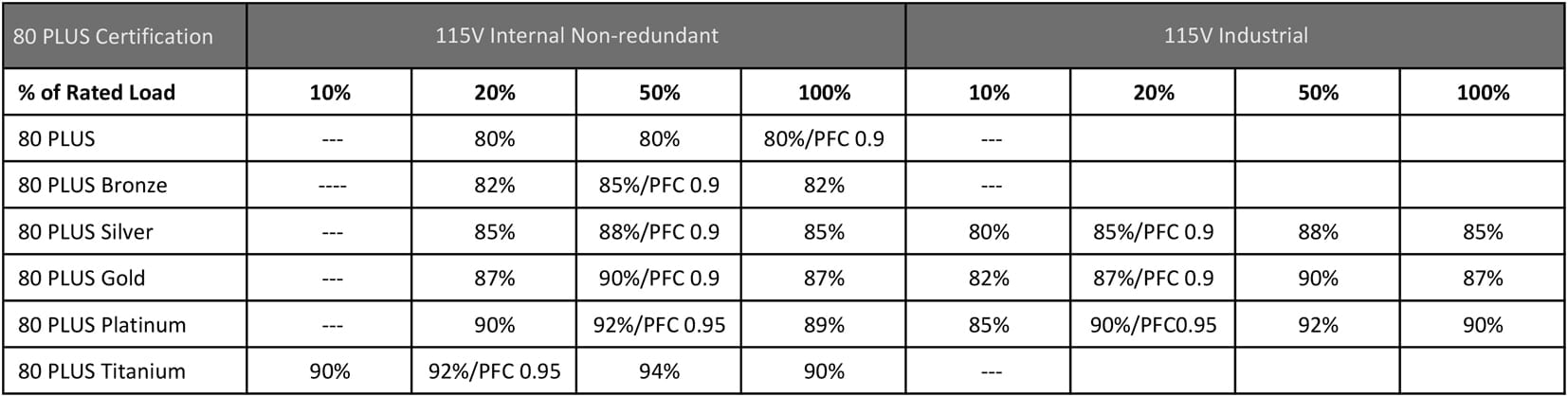 表1 : 此表列出了115V系统的80-PLUS效率标准(来源:维基百科)