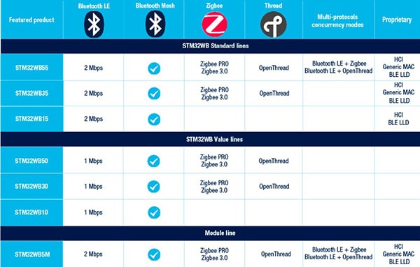 图4:双核多协议无线STM32WB MCU选型参考 (图源:STMicroelectronics)