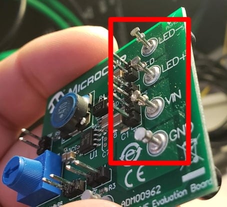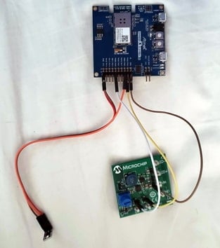 图4:SAM W25板 (顶部) 、TEMT6000光传感器 (左下方) 和LED驱动板 (右下方)