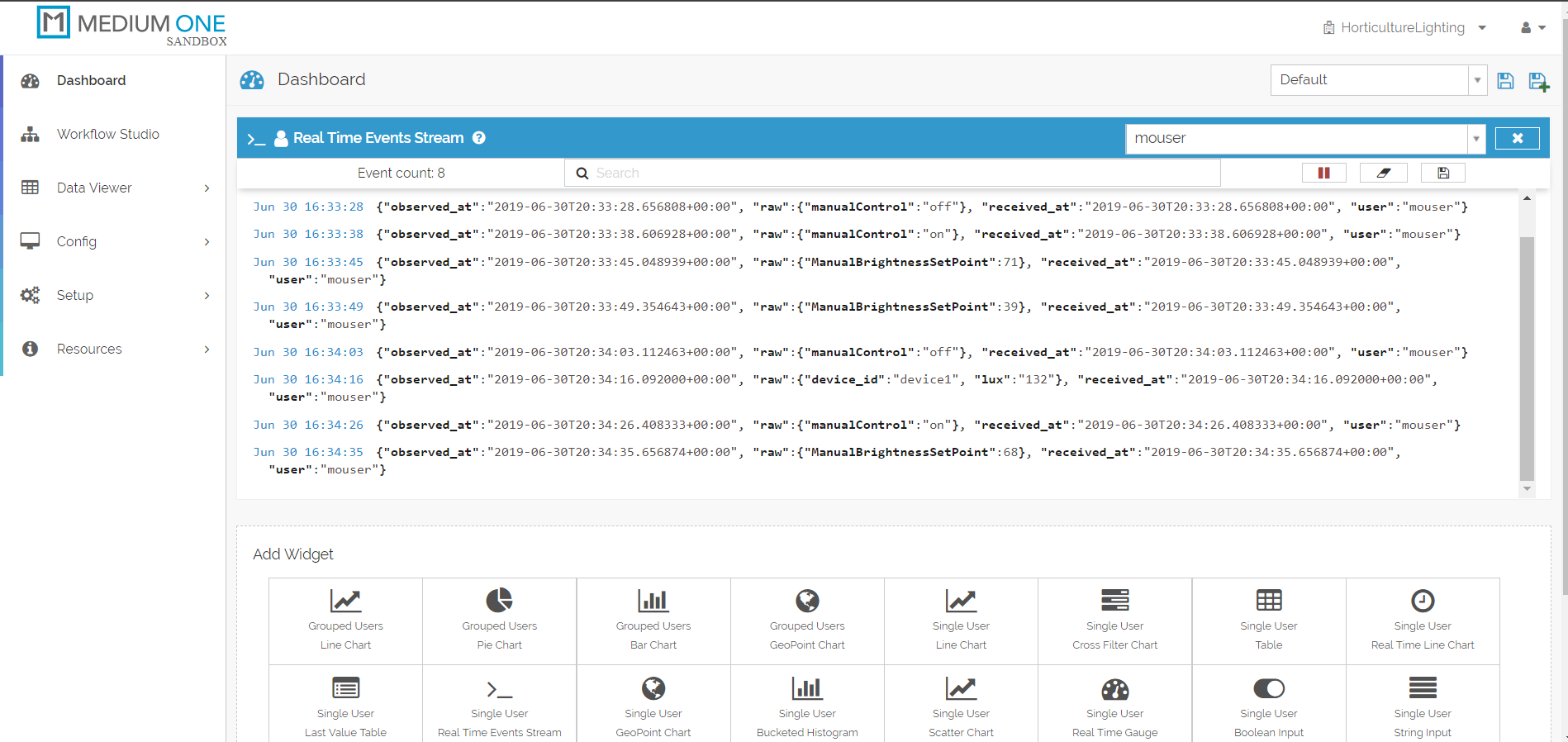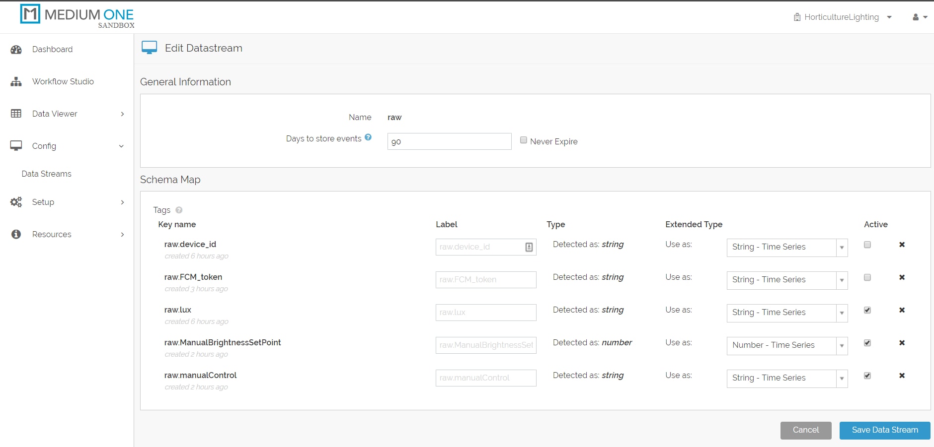 8. 回到台式机上,从Medium One仪表板单击Config>Data Streams>Raw。